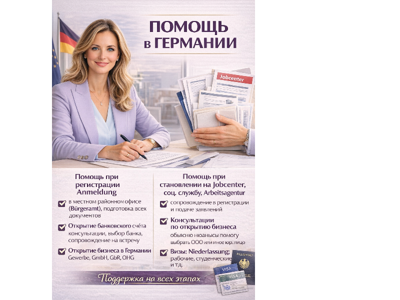 - Помощь при становлении на Jobcenter, соц. службу, Arbeitsagentur (центр занятости): Сопровождение и помощь в регистрации в Jobcenter, подаче заявлений на получение социальной помощи и взаимодействии с центром занятости.